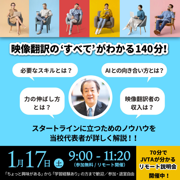 ◆【英日映像翻訳 総合コース・Ⅰ 日曜集中クラスを2026年1月開講!】ご興味をお持ちの方は無料の学校説明会へ! 2026年1月からの英日映像翻訳学習をご検討中の方を対象に、各種説明会を実施しています。ご都合・ご希望に合わせてお選びください。 ※英日映像翻訳の時期開講は2026年4月予定です。ご検討中の方はリモート個別相談にお申込みください。