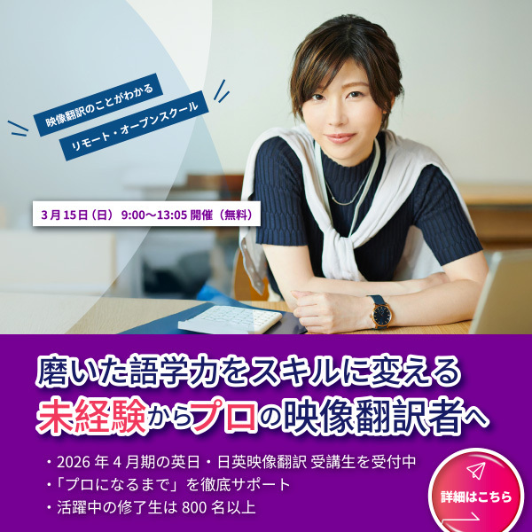◆【2026年4月期の受講申込を受付中 ! 】学校説明会を随時開催! 映像翻訳業界の最新情報解説や字幕翻訳の体験ができる無料イベントを開催中。個別の相談も承っております。映像翻訳にご興味をお持ちの方はお気軽にご参加ください。