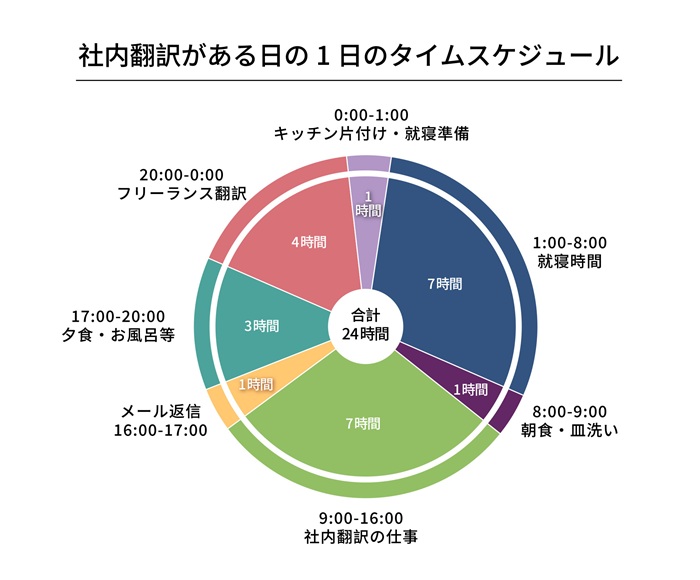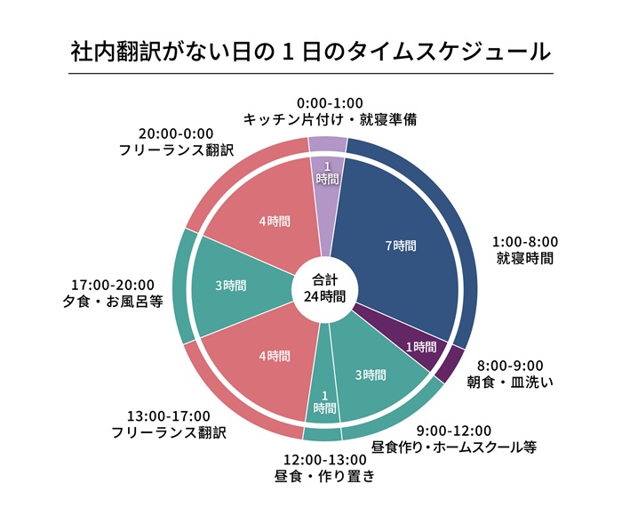 「朝は8時に起床し、日中は主に社内翻訳や家事、ホームスクールなどに充て、20時から24時にフリーランスの翻訳の仕事を行い、1時に就寝というスケジュールで稼働しています。また、下の子がお昼寝をする時間は上の子も勉強に集中する時間と決めて、私も仕事時間を確保しています。週3日の社内翻訳の仕事がない日は、できるだけ午前中に料理を済ませたいのですが、子どもたちがよく食べてくれて作りおきになりません(笑)」(クニサワ未歩さん)