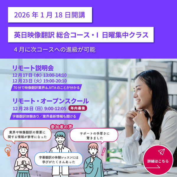 ◆【英日映像翻訳 総合コース・Ⅰ 日曜集中クラスを2026年1月開講!】ご興味をお持ちの方は無料の学校説明会へ!