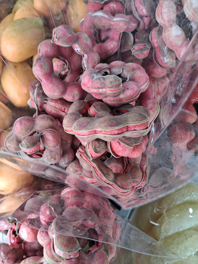 そんな食後にご親戚の一人から「ヨーコ、マカムテー知ってる?」と聞かれました。マカムはタイ語で、いわゆるタマリンド(タイのフルーツ)のこと。我が家にも2本マカムの木があるので、「あ、うちにもあるよ!」と得意げに言ったのですが、みんな疑いの目。「マカムテーだよ!?」そして見せてくれたのが、きれいな黄緑とマゼンタピンクの、グルンと丸まったポン・デ・リング(ミスタードーナツの定番商品ポン・デ・リング)のような形のフルーツ。確かに我が家のマカムは茶色くて長い実で地味。さっそく、その柔らかい黄緑の皮を剥くと、ピンクがかった白い実が。サクサク&スカスカした食感でほんのり甘いかなあ!?我が家の茶色くねっとりしたマカム(タマリンド)とは全く別物。名前は一部一緒でも予想外の果物でした。マカムは日本のスーパーでも売っているくらいだいぶメジャーになって来ましたが、このマカムテーは傷みが早いのでなかなかお目にかかれないようです。まだまだ知らない食べ物があるなあ、国内食の旅にいつか行くのもいいなあと思った一コマでした。
