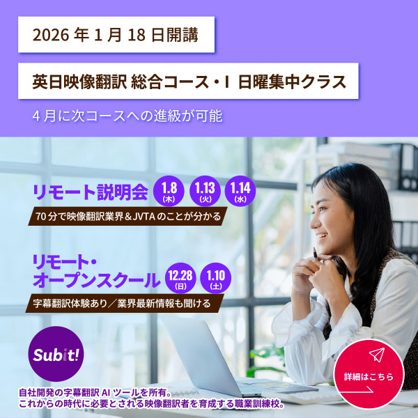 ◆【英日映像翻訳 総合コース・Ⅰ 日曜集中クラスを2026年1月開講!】ご興味をお持ちの方は無料の学校説明会へ!